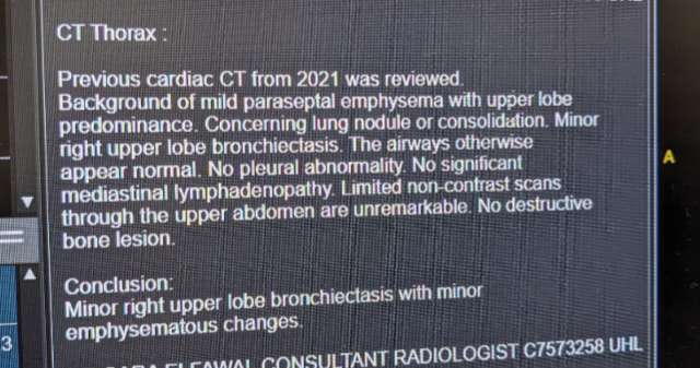 I had been given a CT scan last month as I have been having a tight chest and pain at top right back for a few months - I was due to go into get the results at a Respiratory consult next month.