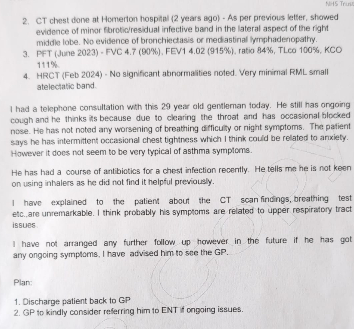 Hi everyone I’m 29 male was having investigations for chronic bronchitis and was told I had it by one pulmonologist now I’ve had my second CT and spiro and these were my results I then got discharged and since then I have had blood in my mucus and many other symptoms would I be crazy asking mp gp to look at cystic fibrosis but could people also help me with what the results mean