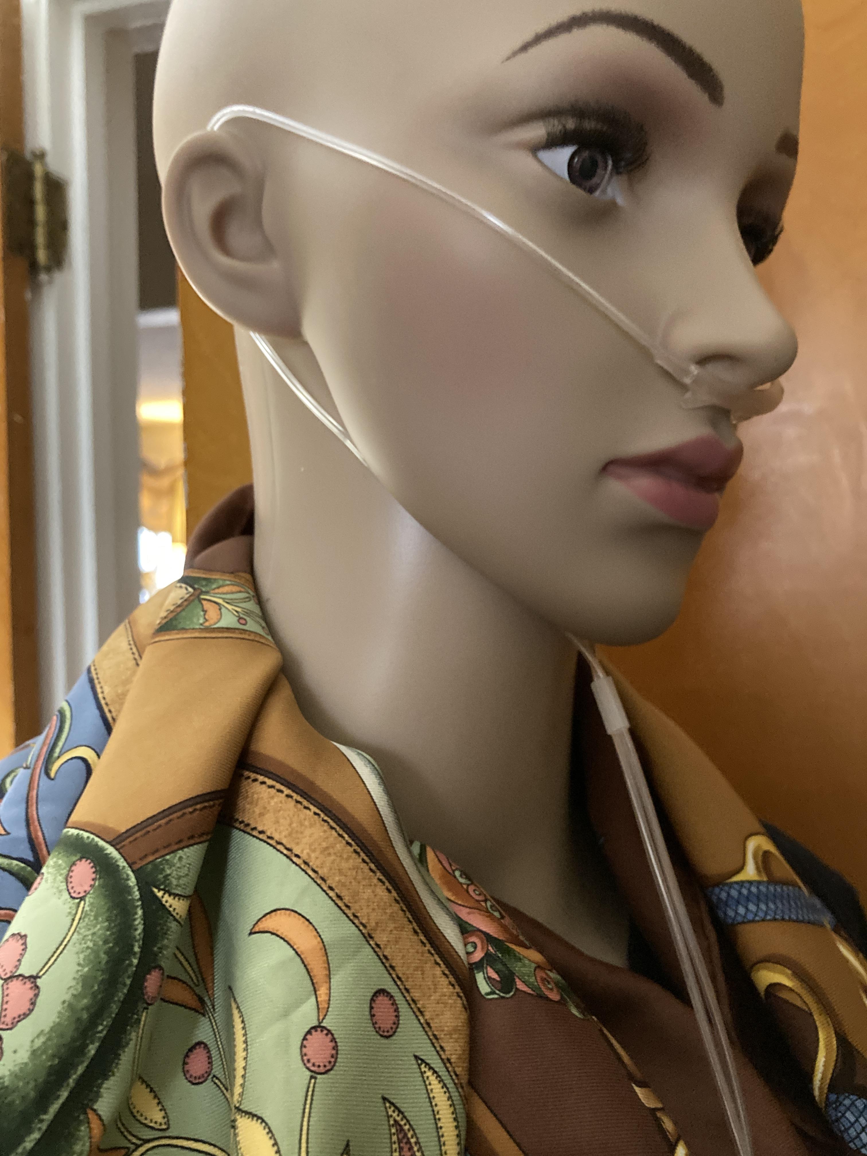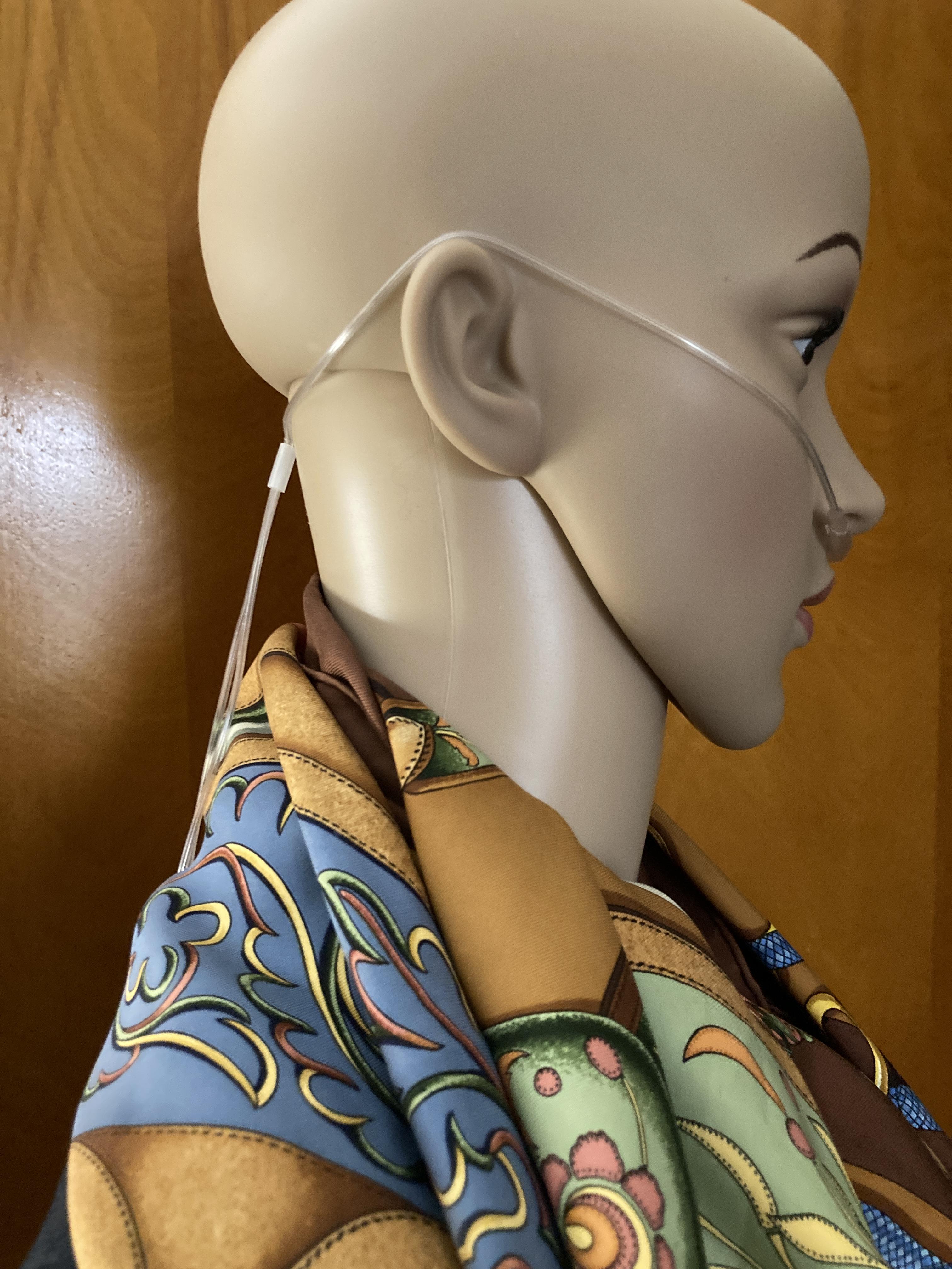 When I left the clinic as a brand-new oxygen user, they gave me a big tank to take home. In putting it in the back seat, as they recommended, I had to remove the cannula. Since the tank was behind me, I think I just put the cannula on with the hose behind me, too. I have worn it that way since then. Here's what it looks like on a mannequin: