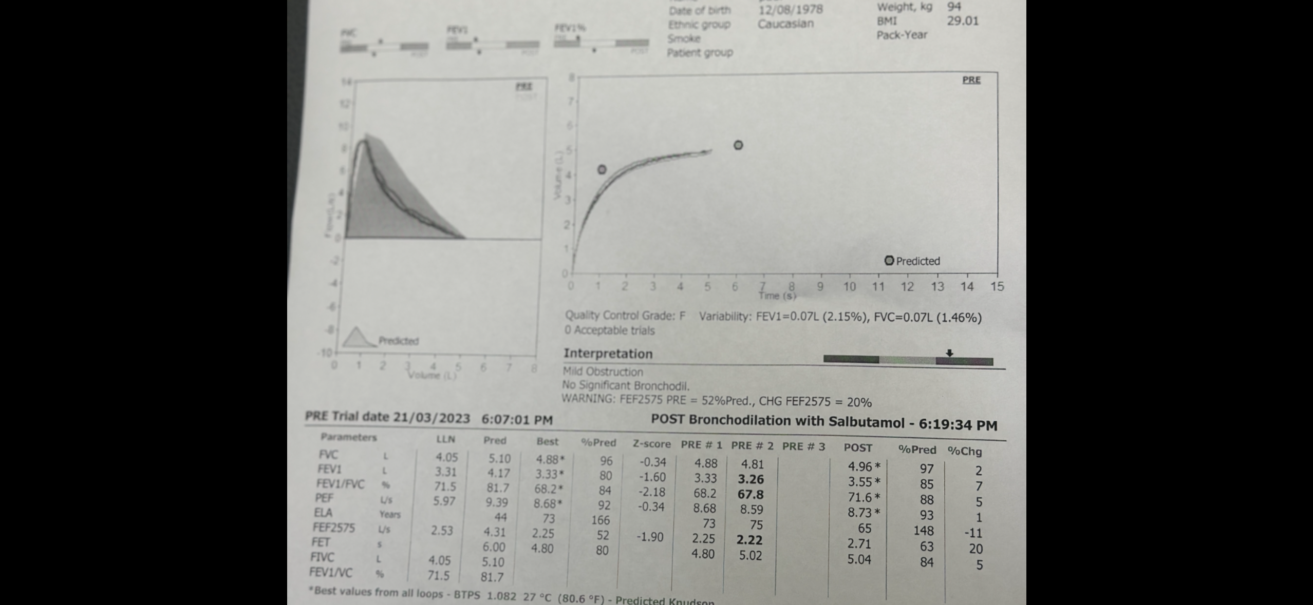 My recent diagnosis of COPD has made me aware of symptoms I have had for a few years now. I had just put it down to being unfit. However they do come and go. Some days I have been able to walk 15km and other days I am out of breath after only 100m or so. Could this be asthma? I Didnt have asthma as a kid. The doctor has said the results are almost normal and maybe I just didn't blow hard enough. I have attached my spirometry results for reference. I am only 44 so was very surprised by the results and now have had weeks of anxiety which isnt helping.. any ideas would be appreciated. Thanks
