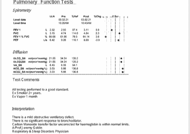 My Gp said it’s mild COPD. Having done some research since I think she diagnosed it looking at the fev1/fvc ratio.