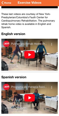 - NEW EXERCISE VIDEOS: We have added several new exercise videos to the app, one of which is fully in Spanish. Many thanks to our colleagues Christina Hunt, RRT and New York-Presbyterian/Columbia’s Fauth Center for Cardiopulmonary Rehabilitation for these two sets of videos. We hope you will find something in these activities that is appropriate and helpful for you. As always, check with your physician before starting any exercise program.