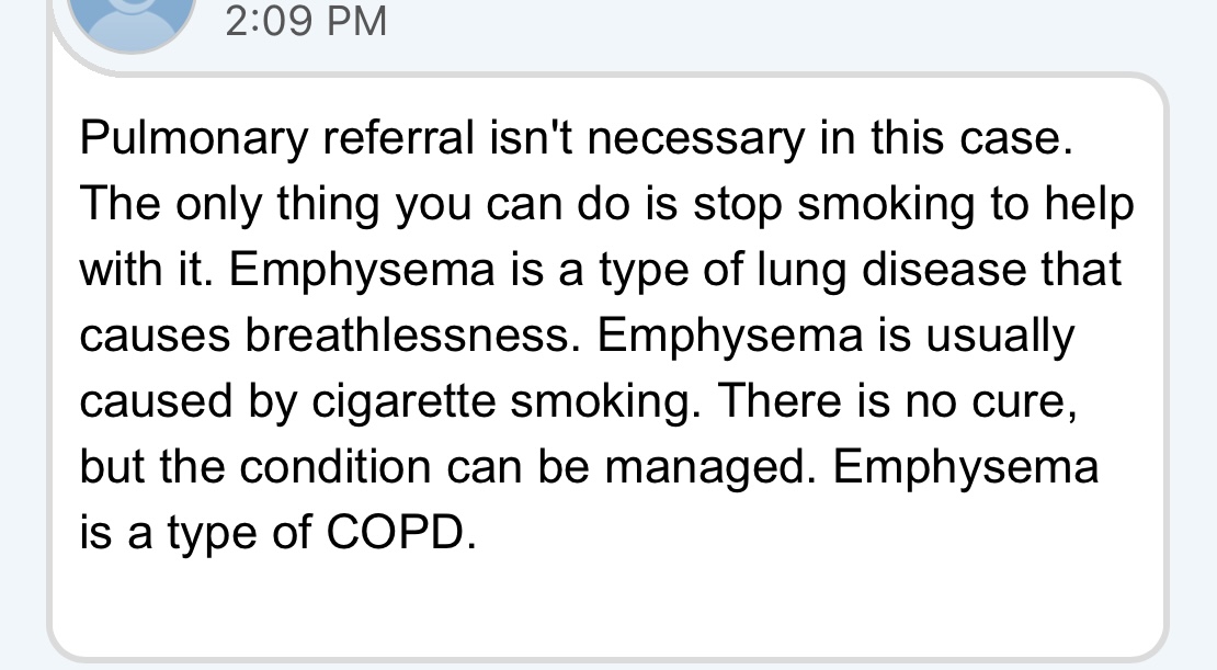 So this is what my dr’s office had to say. I had called the pulmonologist to see if I could get an appointment and they said their dr’s required a referral. Looks like I’m not getting one. What do I do? Someone mentioned an urgent care I believe. I’m just destroyed now.