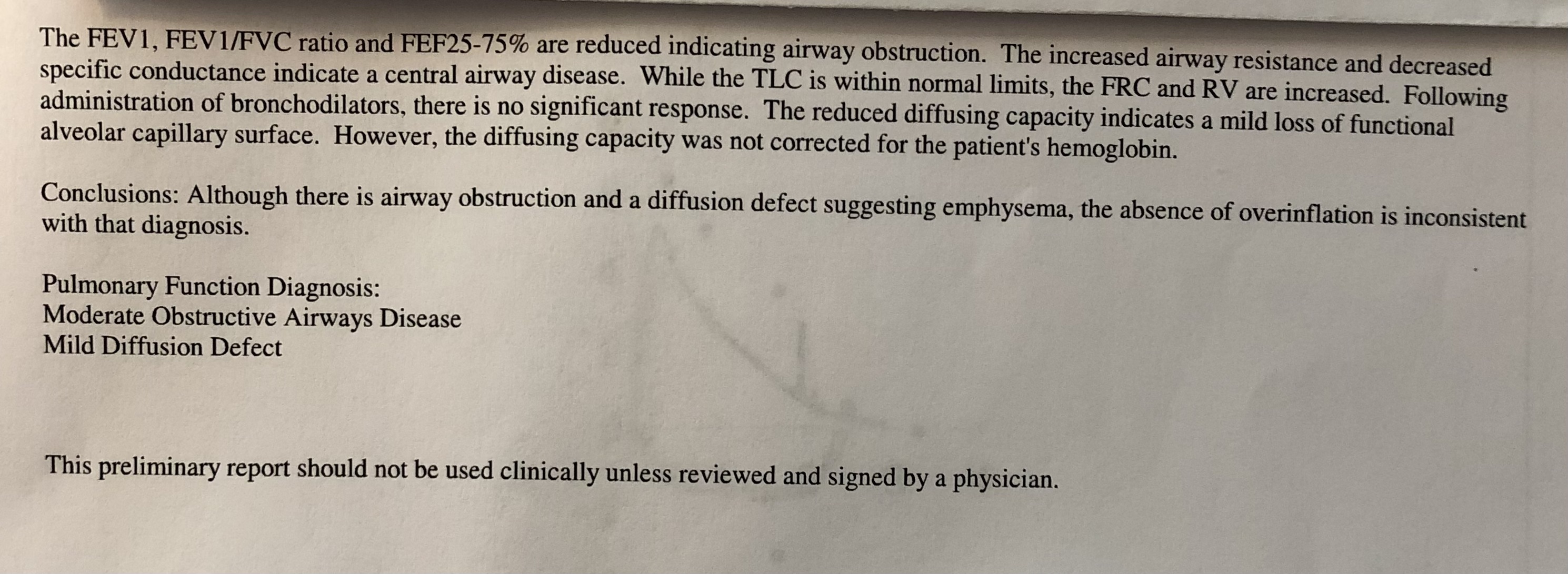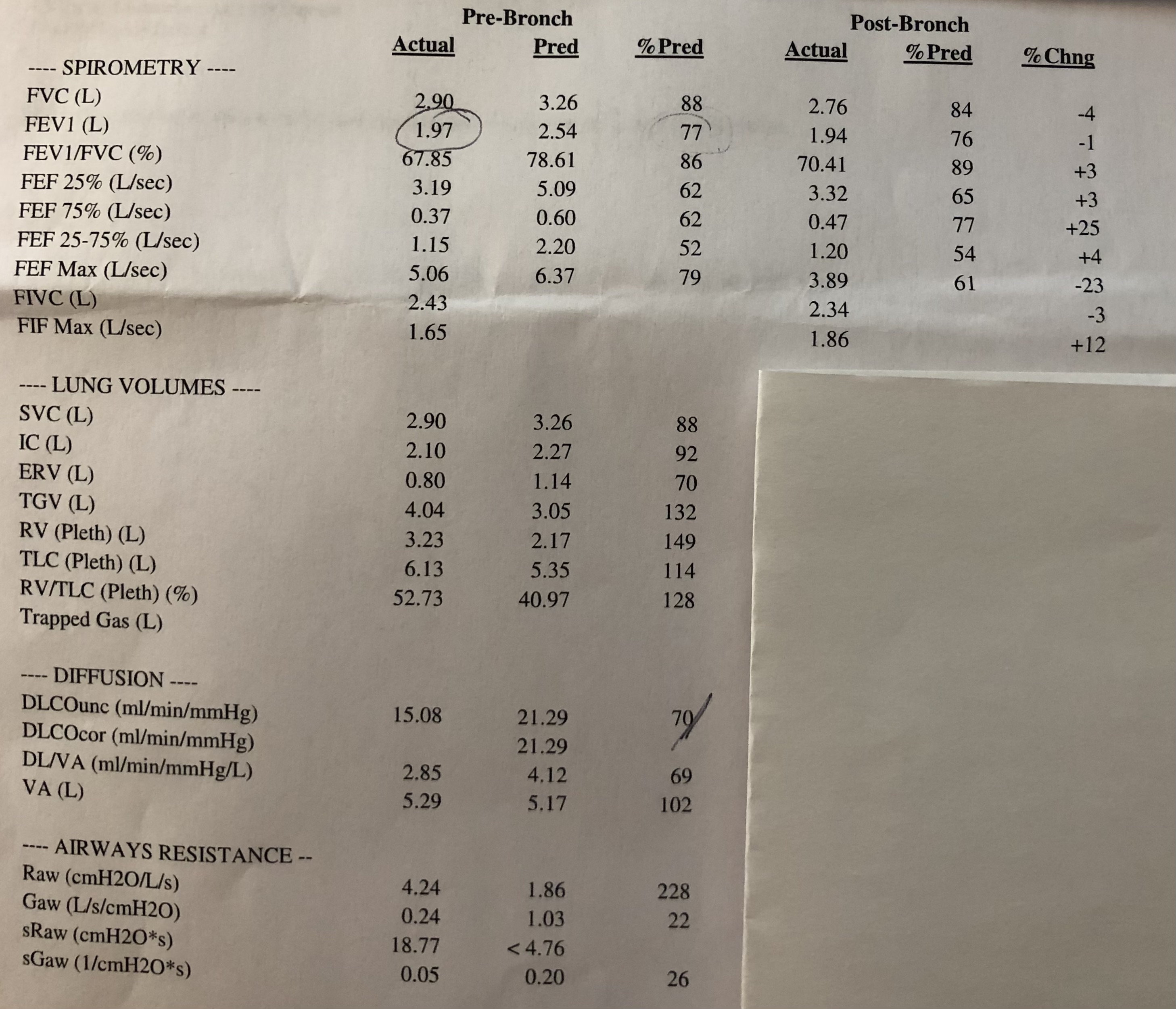 Before thanksgiving I had gotten sick and needed antibiotics and steroids. They helped for about a week, then I went back to feeling SOB and wheezing. I finally went back to a new doctor about 5-6 weeks later and he did new PFT tests before Christmas. He gave me antibiotics and steroids including a shot in the arm in the office. My new tests are attached. I think they are a little better than a year ago, but I find it confusing to interpret these things. The doc said I was on the mild side, but I sure don't feel so mild right now. I am back to feeling SOB. No wheezing though. He also gave me a scrip for Trelegy which I am leery about starting quite yet. I wanted to get over whatever is going on first before starting something new so I know what works and what doesn't. Plus, I have a stockpile (about 6 mos) of Spiriva I wanted to use up first.