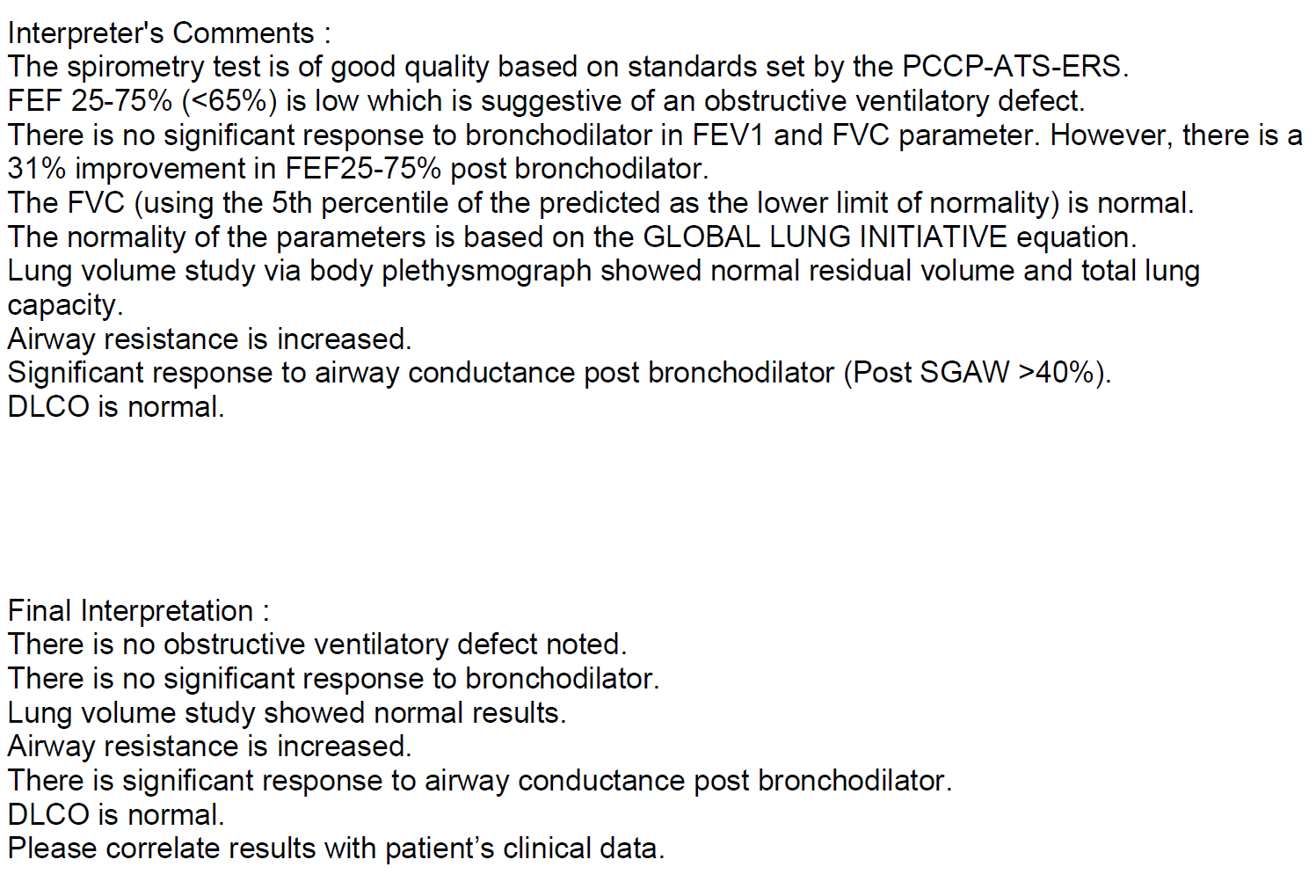 Hello, I would like to have second opinion of my PFT result. Any help would be greatly appreciated. My pulmonologist said I have asthma but the final interpretation did not say anything.