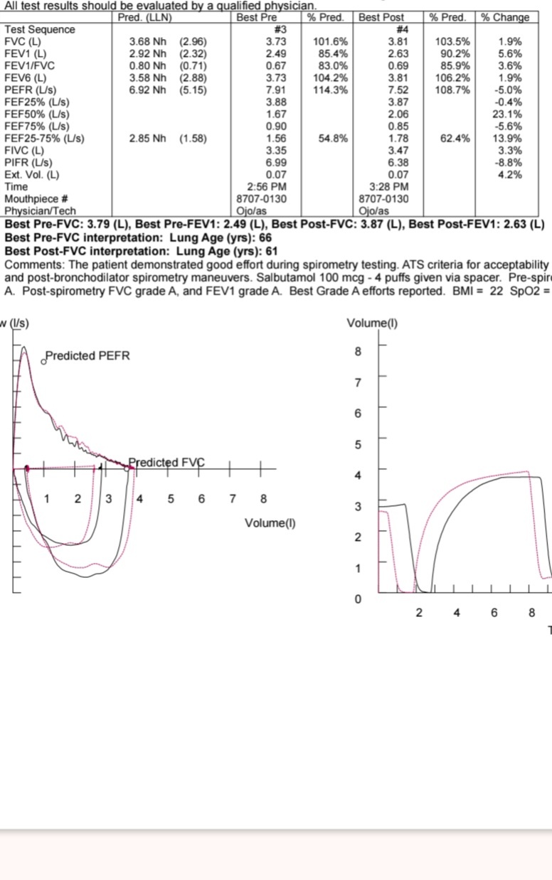 I’d like to share my new spirometry results, taken seven months after the original test, and would really appreciate it if the doctor could weigh in on the findings. I should mention that I rehomed my five pet birds about six months ago (which was difficult, but my doctor recommended it), and I had just recovered from bronchitis and COVID roughly six weeks before the first test.