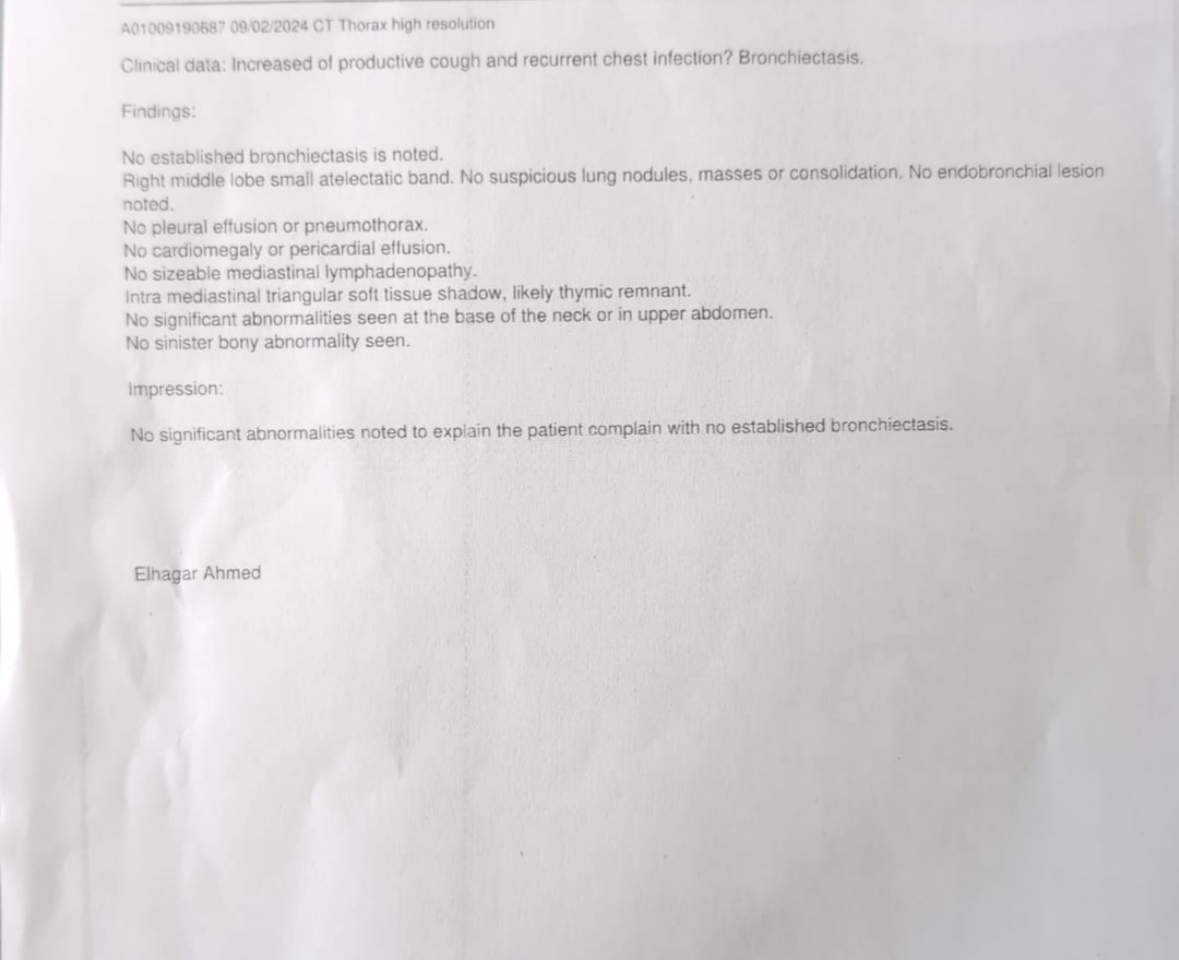 Hi everyone I’m 29 male was having investigations for chronic bronchitis and was told I had it by one pulmonologist now I’ve had my second CT and spiro and these were my results I then got discharged and since then I have had blood in my mucus and many other symptoms would I be crazy asking mp gp to look at cystic fibrosis but could people also help me with what the results mean