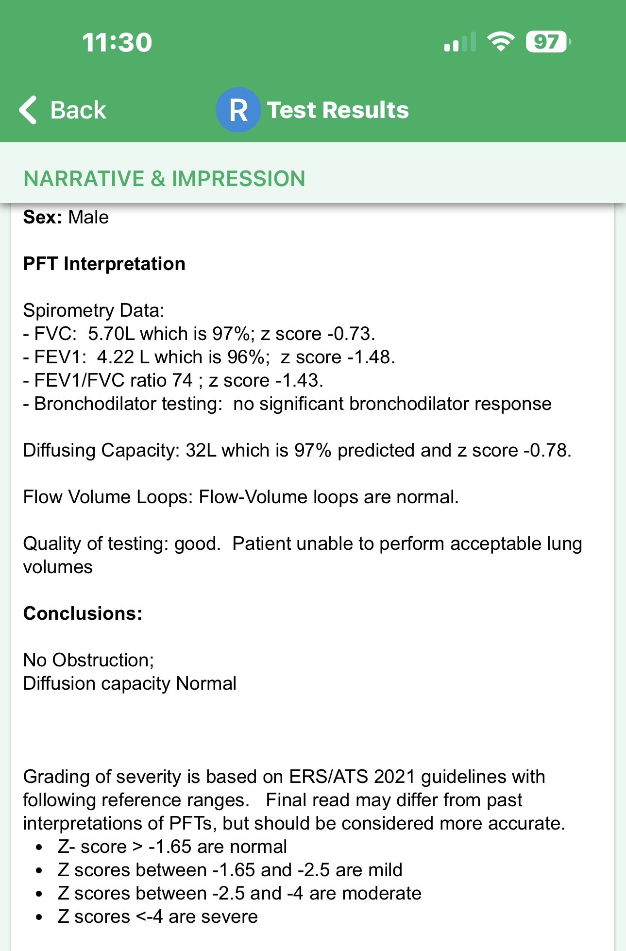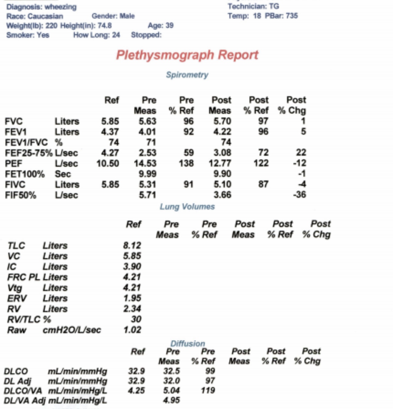 I am a 39 year old male with a 1-1/2 pack/day smoking history of about 25 years. I’ve had the expected symptoms of occasional wheeze, especially while laughing, and sometimes become sob, even at rest. Saw pulmonary recently because of ongoing wheeze post 1 month sinus infection and bronchitis. Chest X-ray showed no abnormalities so I was placed on flovent, which I only completed 2 week dose due to concerns with adrenal suppression as I’ve experienced this before. Pft completed this day with results below. Can anyone help me interpret what this all means? The impression states no obstruction but some of the values seem off. Thanks!