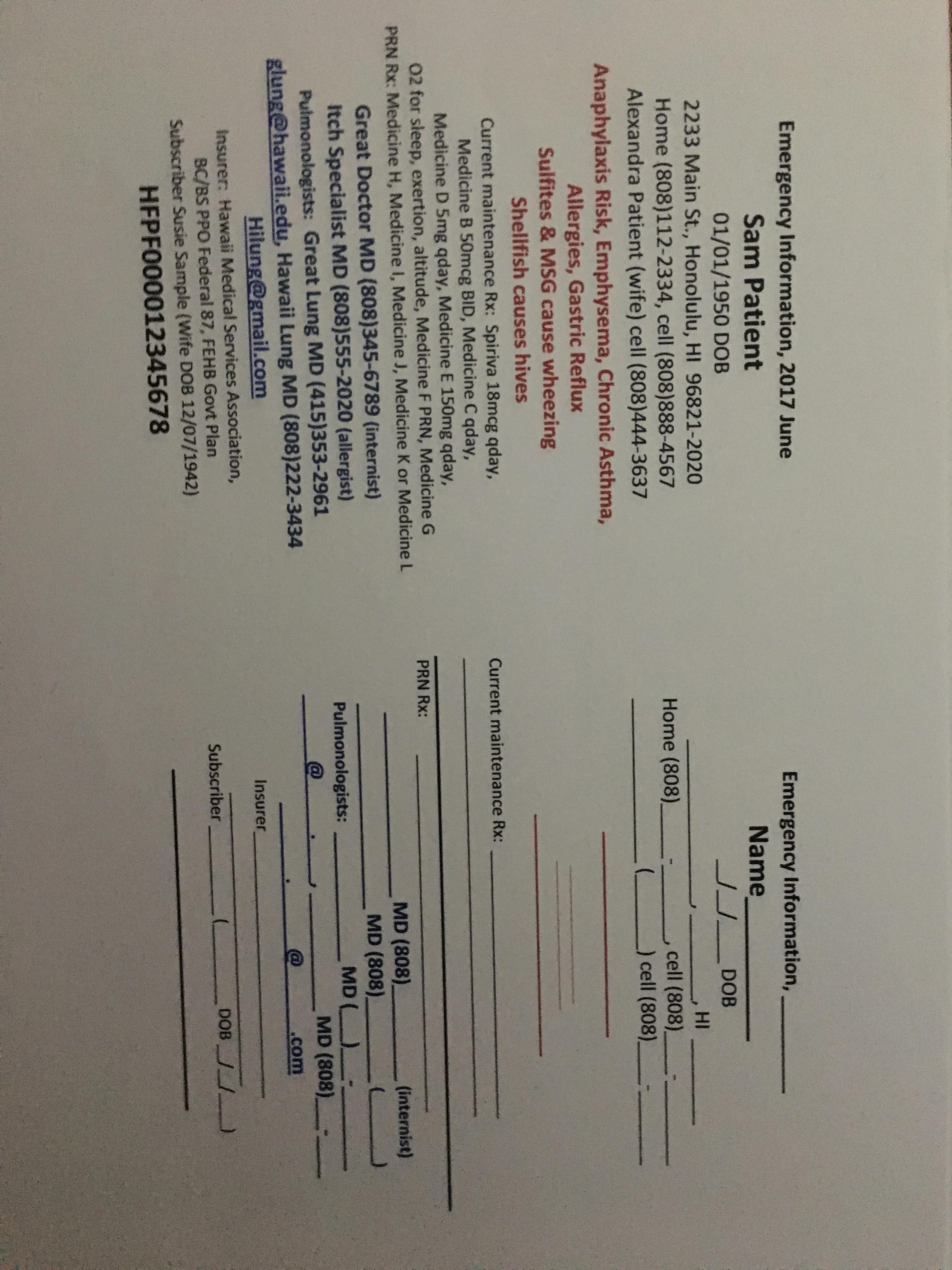 Having the medication list kept up to date as well as the providers and contact info is very handy. I can just hand it to the providers when I check in for my appointments and they can ask about or note any changes. It's a lot easier having all the information in ONE place. I make two copies of my current information on cardstock and trim to fit --one in my wallet and the other in my medication bag. I put packaging tape over it, to make it more durable and water resistant.