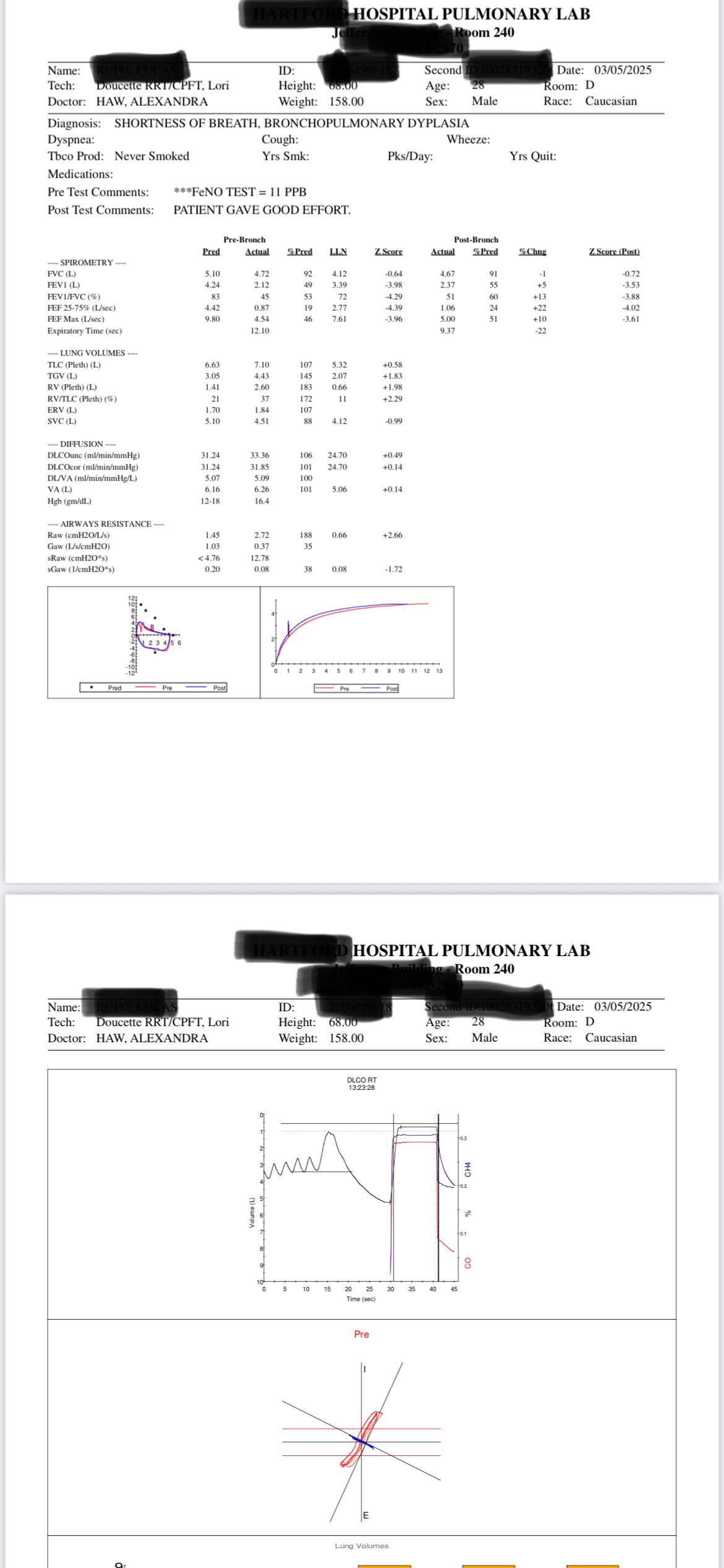 I’m not really coughing or wheezing. But I wheeze through my nose constantly and have been for several months. I only wheeze consistently when mouth breathing if I forcefully exhale. But I have chest tightness, sometimes near the heart (sternum area) and other times along the left breast or ribs. It used to come and go. For example, in January and February, it had subsided completely. Panic attacks seem to exacerbate the condition. In early August, I suffered multiple panic attacks at my work’s office, which led me to become more secluded. I don’t think I’ve left my apartment in a few weeks aside from going downstairs to get mail. I’m afraid something will happen to me. The chest tightness sometimes gets worse with exercise, especially since my call with the pulmonologist this week. I’ve been burping nonstop since November last year. I’m taking omeprazole now and the degree it helps varies day to day. It’s hard to tell if the Trelegy is helping since I felt fine breathing-wise before I was told something with my lungs. These past couple nights have been scary. I’ve woken up in the middle of the night with my chest feeling really tight. Idk if I’m imagining it, but it feels like my left side of my chest is pushed out more than the right and as though my ribs aren’t symmetrical in position. Within a couple breaths it returns to normal though.